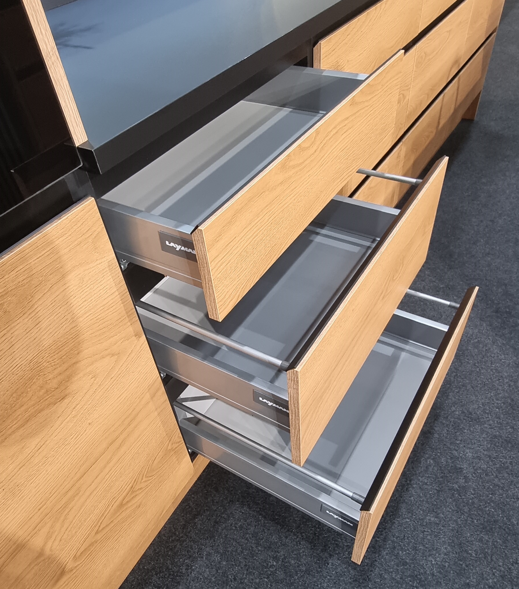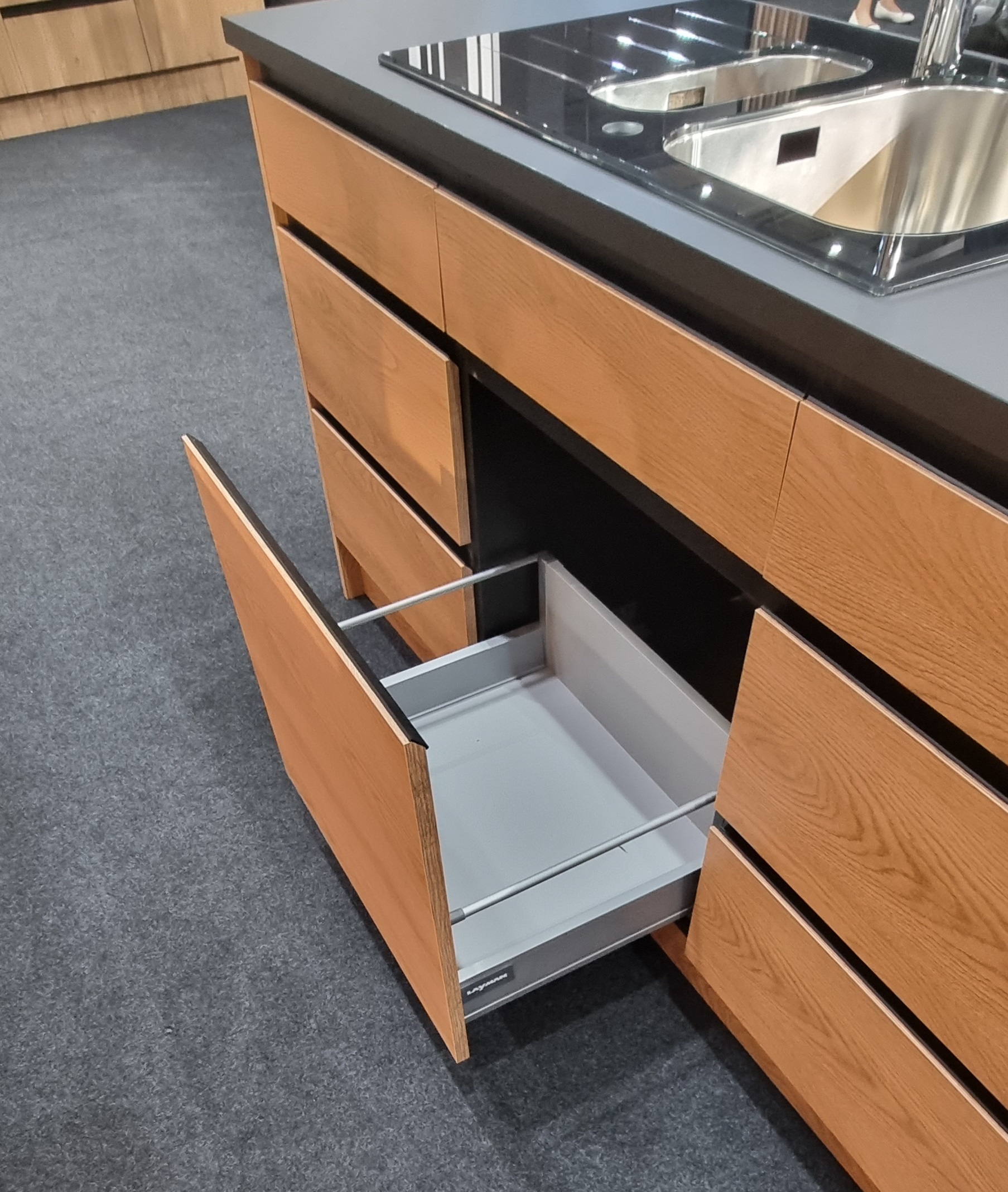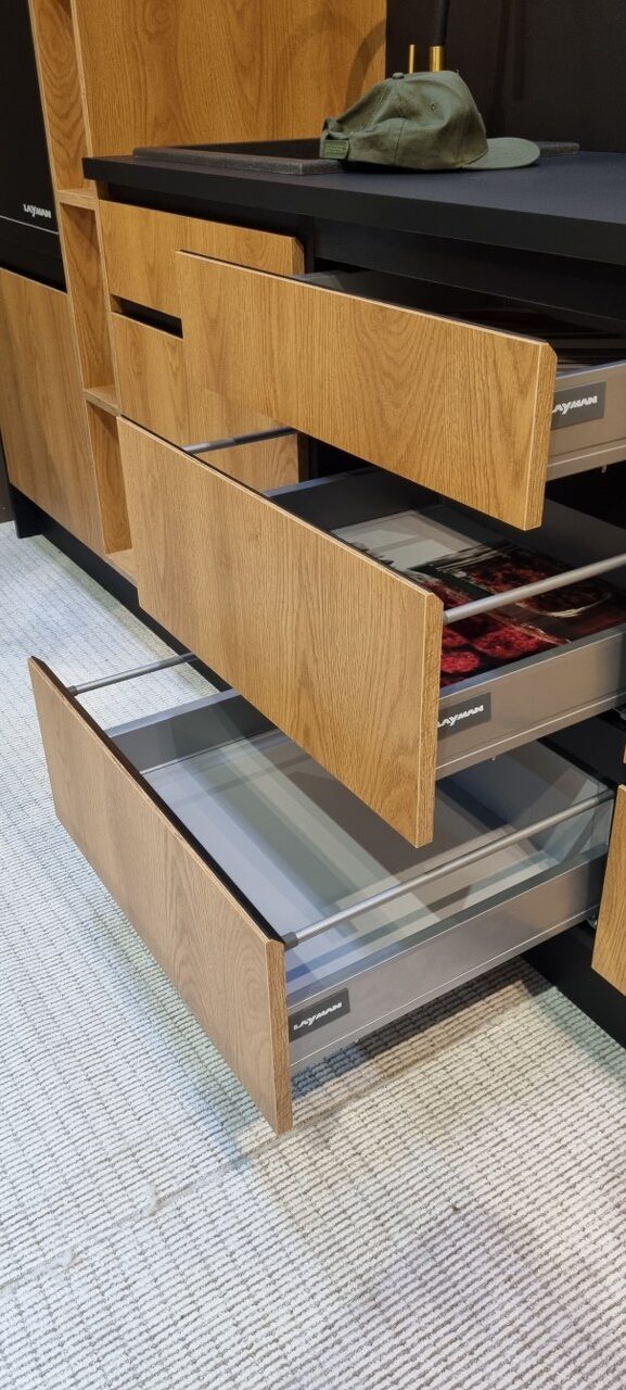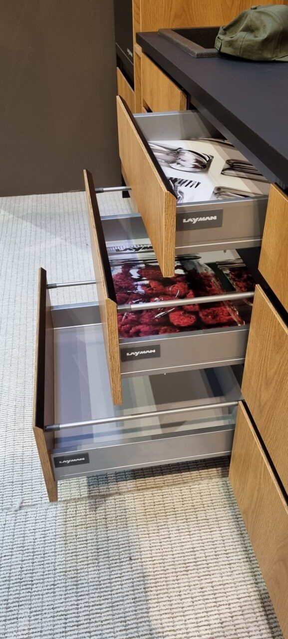 W opcji dodatkowej oferujemy prowadnice szuflad o podwyższonej odporności na obciążenia, wyposażone w cichy domyk