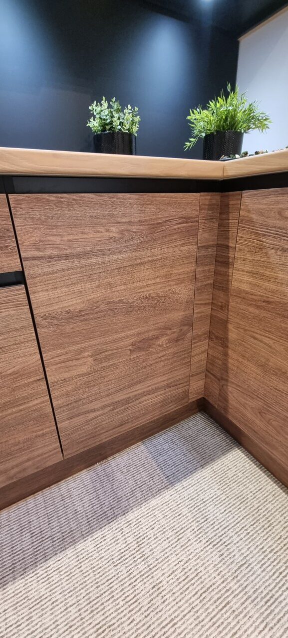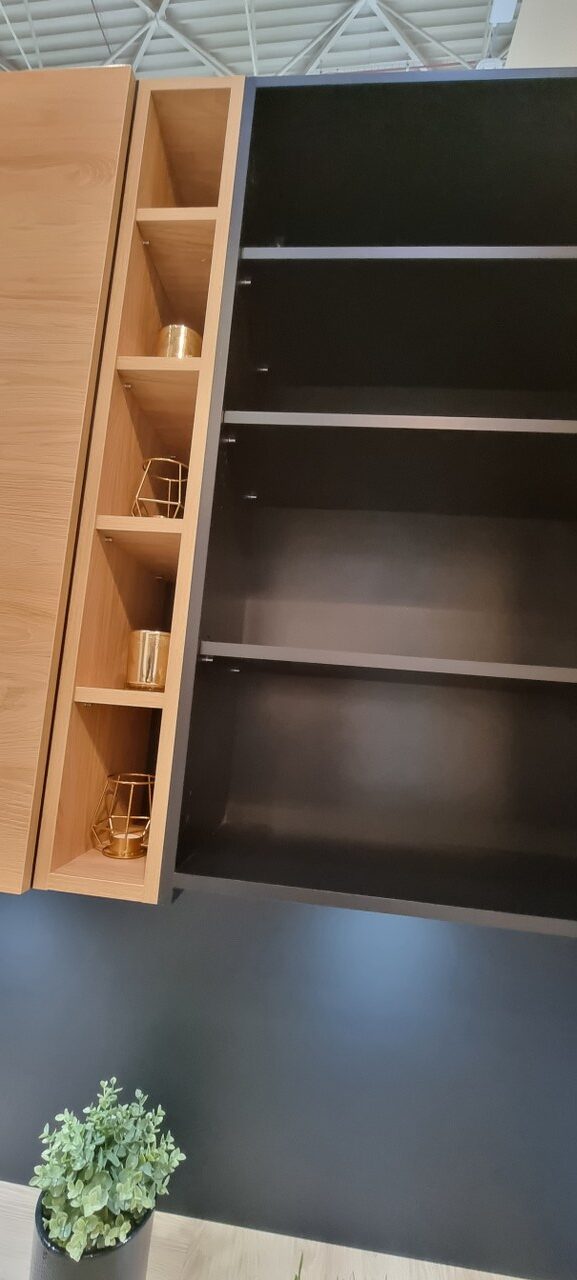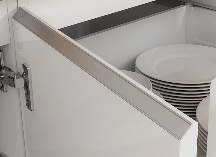 Dolne fronty posiadają frezowany uchwyt z nakładką w kolorach aluminium lub czarny mat.