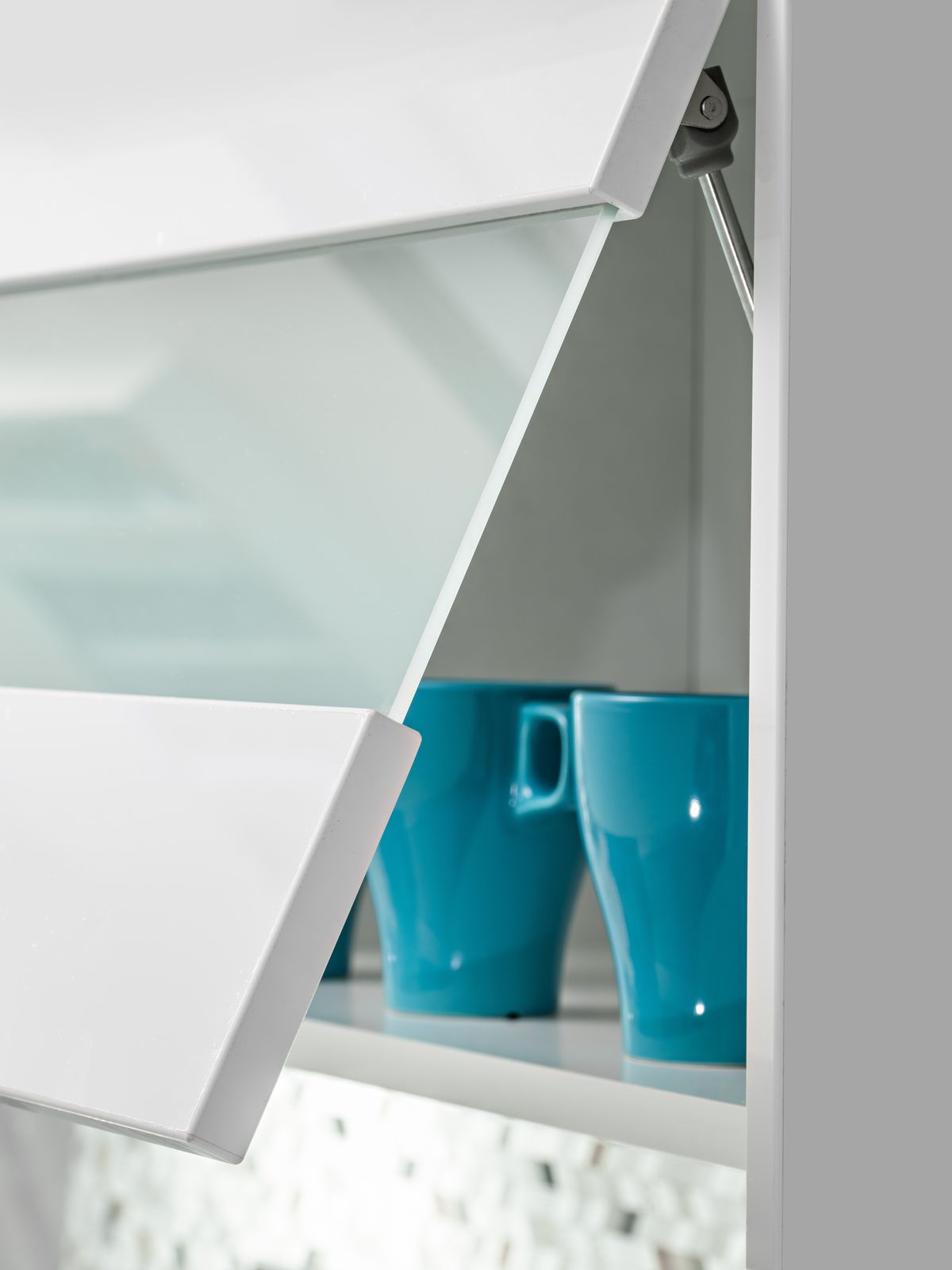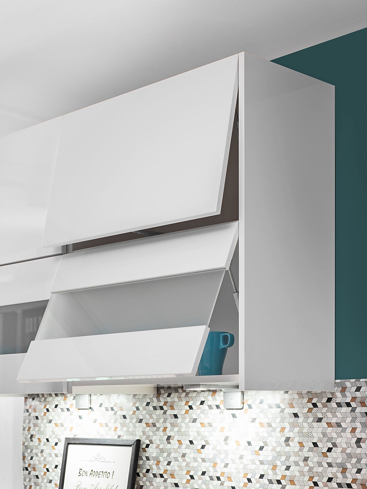 Szafki wiszące otwierane są od spodu za dolną krawędź frontu.