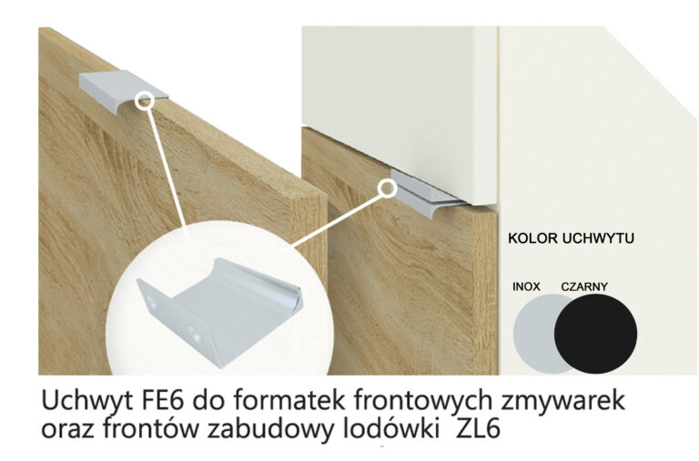 Fronty szafki do zabudowy lodówki oraz fronty do zabudowy zmywarki, wyposażone są w uchwyty typ FE 6 w kolorze aluminium lub czarnym